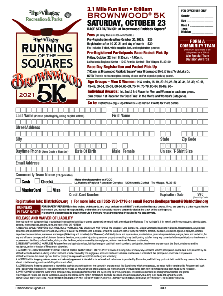 3.1 Mile Fun Run 8:00amBROWNWOOD 5K SATURDAY, OCTOBER 23RACE START/FINISH: at Brown wood Paddock Squares (All entry fees are nonrefundable.)FOR OFFICE USE ONLY Gender___ Age___ Race #___ Team Division___FORM