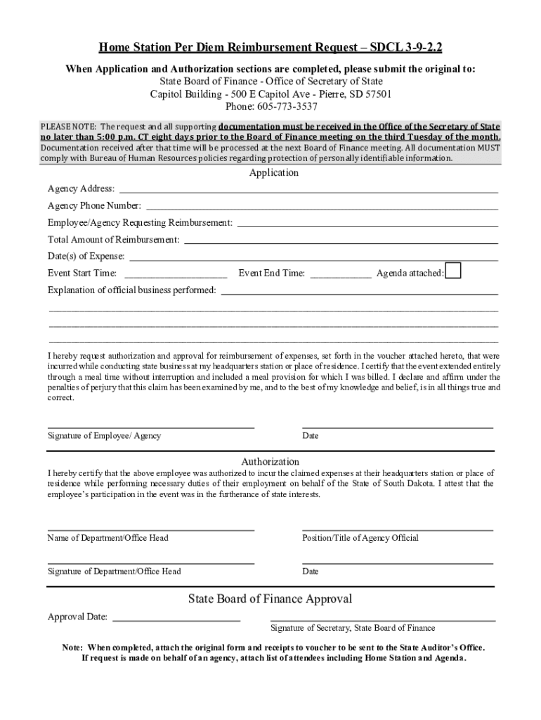 Home Station Per Diem Reimbursement Request DCL 392.2 When Application and Authorization sections are completed, please submit the original to: State Board of Finance Office of Secretary of State