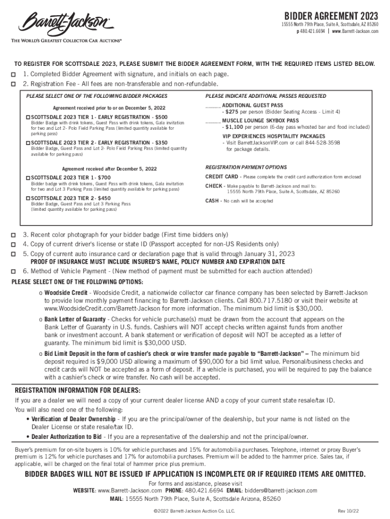 BIDDER AGREEMENT 202315555 North 79th Place, Suite A, Scottsdale, AZ 85260 p 480.421.6694 | www.BarrettJackson.comTO REGISTER FOR SCOTTSDALE 2023, PLEASE SUBMIT THE BIDDER AGREEMENT FORM, WITH THE