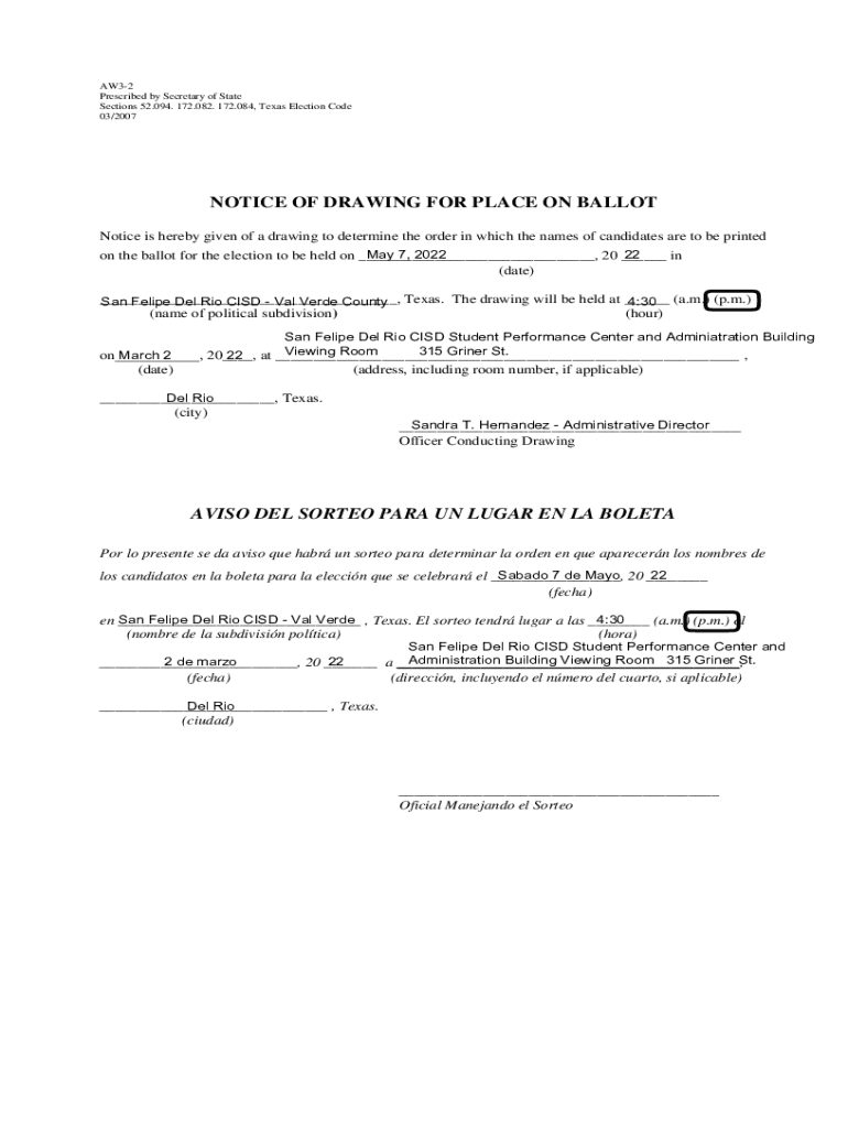AW32 Prescribed by Secretary of State Sections 52.094. 172.082. 172.084, Texas Election Code 03/2007NOTICE OF DRAWING FOR PLACE ON BALLOT Notice is hereby given of a drawing to determine the order