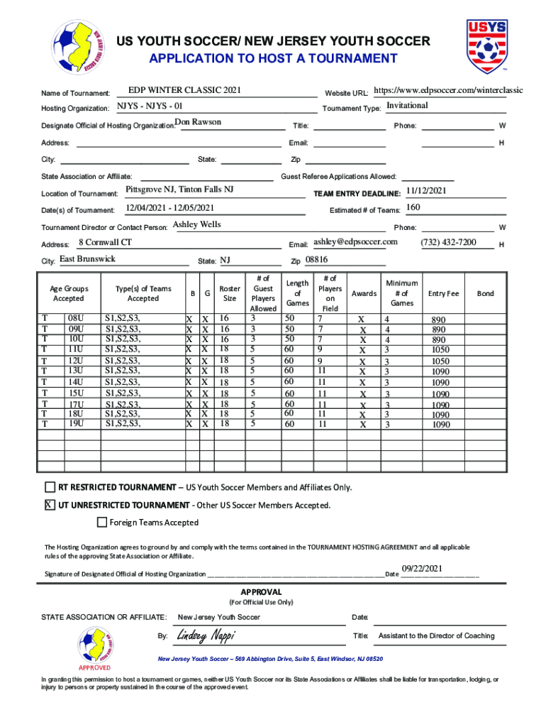 US YOUTH SOCCER/ NEW JERSEY YOUTH SOCCER APPLICATION TO HOST A TOURNAMENT EDP WINTER CLASSIC 2021Name of Tournament:Website URL:NAYS 01Hosting Organization:Tournament Type:Designate Official of Hosting