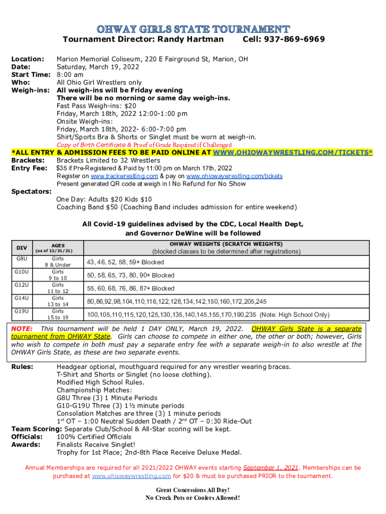 AWAY GIRLS STATE TOURNAMENTTournament Director: Randy Hartnell: 9378696969Location: Date: Start Time: Who: Weighing:Marion Memorial Coliseum, 220 E Fairground St, Marion, OH Saturday, March 19, 2022
