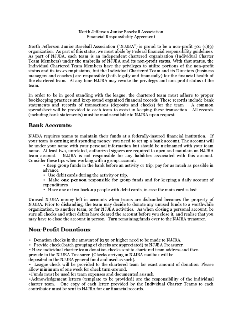 North Jefferson Junior Baseball Association Financial Responsibility Agreement North Jefferson Junior Baseball Association (NBA) is proud to be a nonprofit 501 (c)(3) organization. As part of this