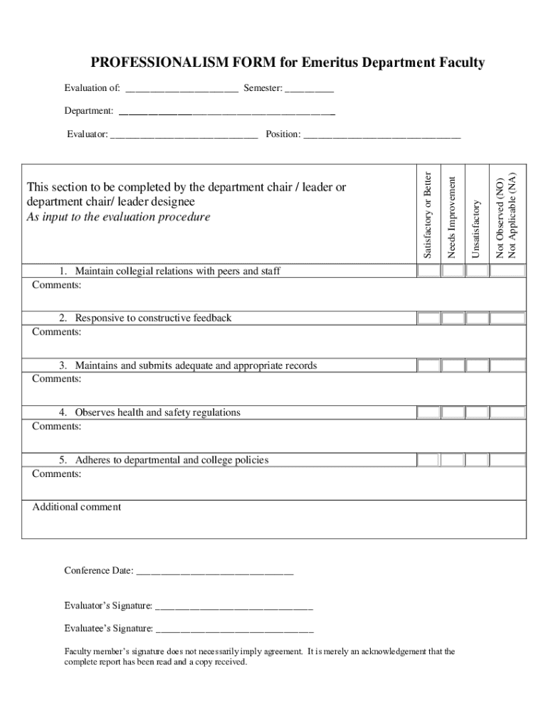 PROFESSIONALISM FORM for Emeritus Department Faculty Evaluation of: ___ Semester: ___ Department: ___1. Maintain collegial relations with peers and staff Comments: 2. Responsive to constructive feedback