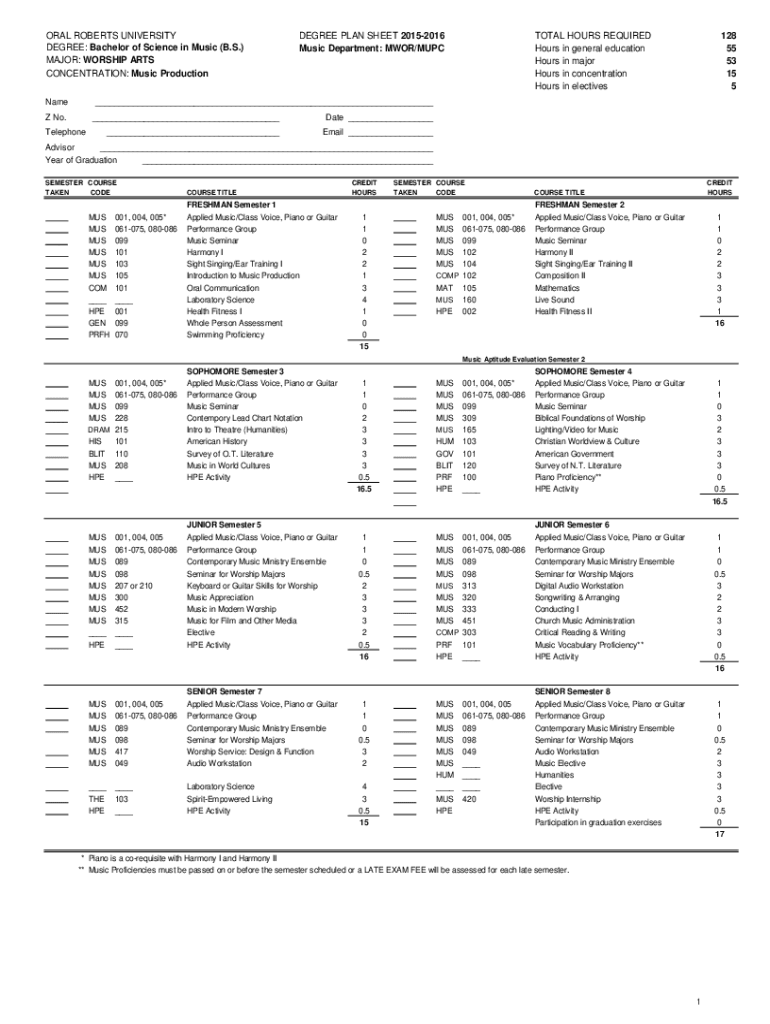 ORAL ROBERTS UNIVERSITY DEGREE: Bachelor of Science in Music (B.S.) MAJOR: WORSHIP ARTS CONCENTRATION: Music Production Nondegree PLAN SHEET 20152016 Music Department: MOOR/SUBTOTAL HOURS REQUIRED