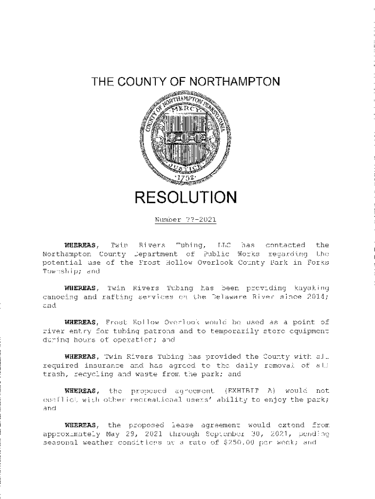 THE COUNTY OF NORTHAMPTONRESOLUTION Number ??2021has contacted the WHEREAS, Twin Rivers Tubing, LLC Northampton County Department of Public Works regarding the potential use of the Frost Hollow Overlook