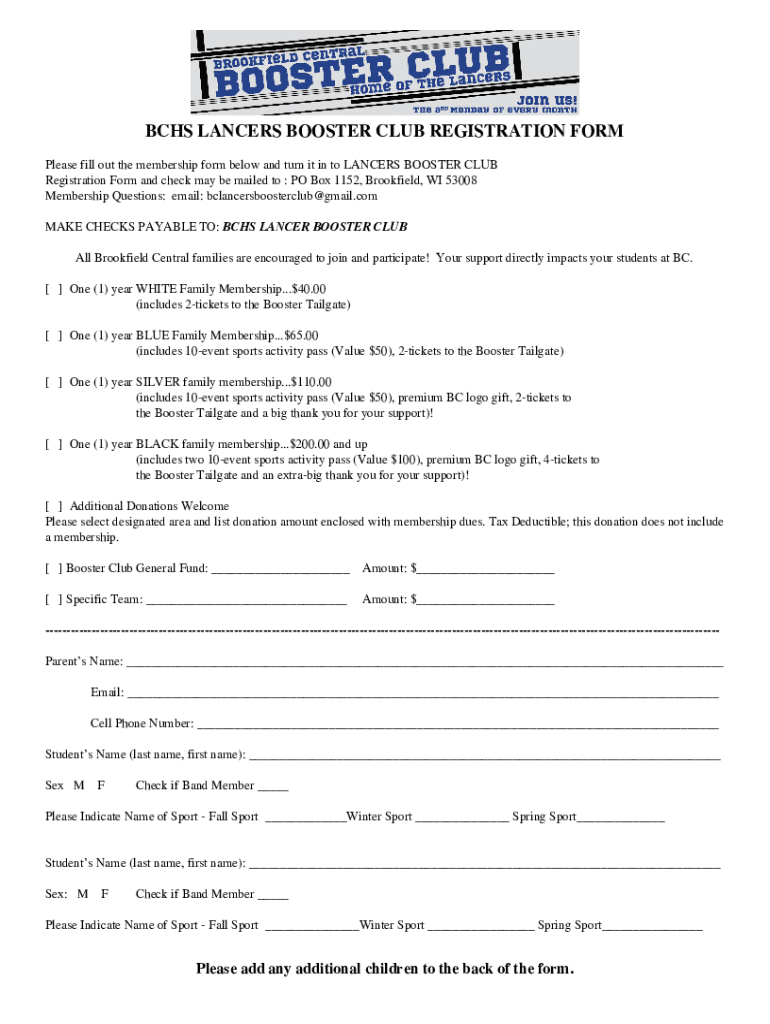 BCH LANCERS BOOSTER CLUB REGISTRATION FORM Please fill out the membership form below and turn it in to LANCERS BOOSTER CLUB Registration Form and check may be mailed to : PO Box 1152, Brookfield,