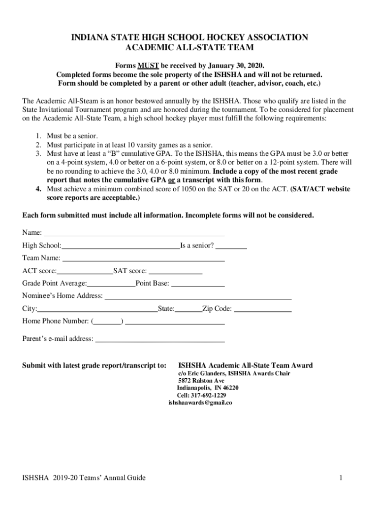 INDIANA STATE HIGH SCHOOL HOCKEY ASSOCIATION ACADEMIC ALLSTATE TEAM Forms MUST be received by January 30, 2020. Completed forms become the sole property of the SASHA and will not be returned. Form
