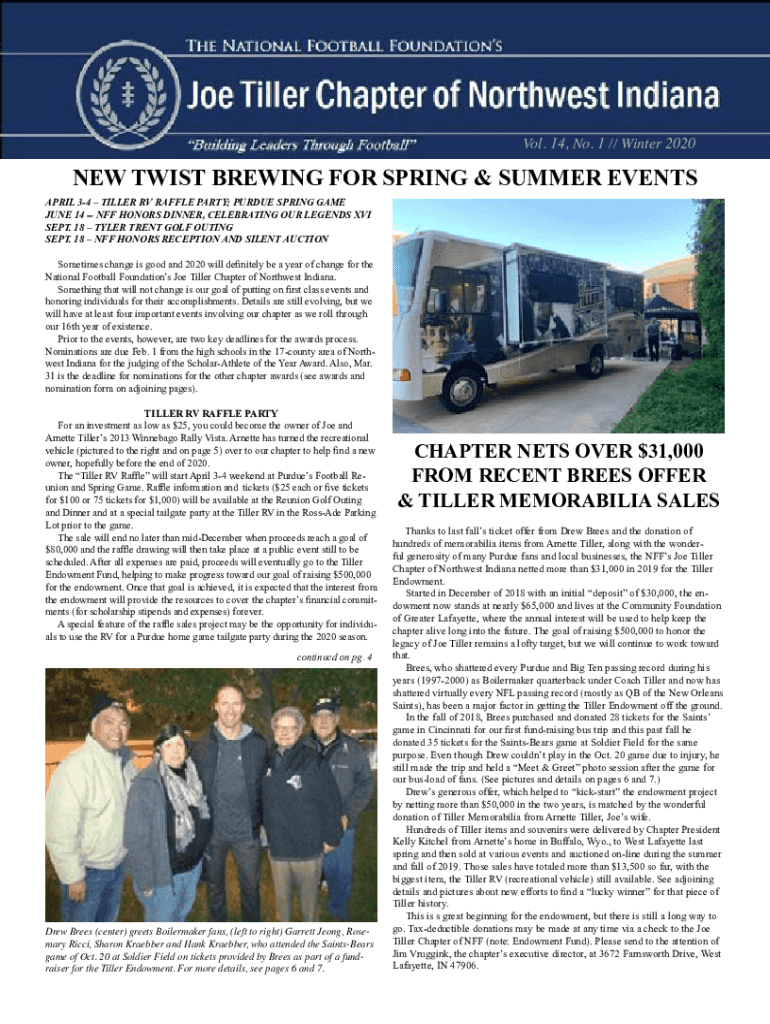 Vol. 14, No. 1 // Winter 2020NEW TWIST BREWING FOR SPRING & SUMMER EVENTS APRIL 34 TILLER RV RAFFLE PARTY; PURDUE SPRING GAME JUNE 14 NFF HONORS DINNER, CELEBRATING OUR LEGENDS XVI SEPT. 18 TYLER