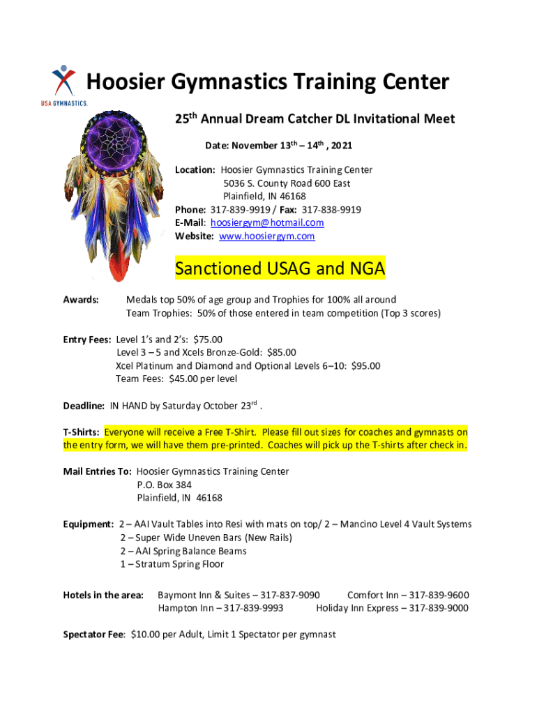 Hoosier Gymnastics Training Center 25th Annual Dream Catcher DL Invitational Meet Date: November 13th 14th, 2021 Location: Hoosier Gymnastics Training Center 5036 S. County Road 600 East Plainfield,