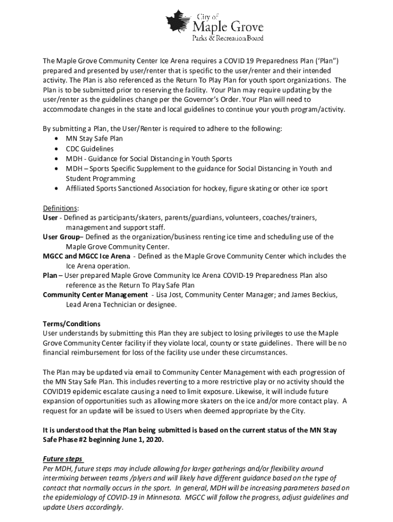 The Maple Grove Community Center Ice Arena requires a COVID-19 Preparedness Plan (Plan) prepared and presented by user/renter that is specific to the user/renter and their intended activity. The Plan