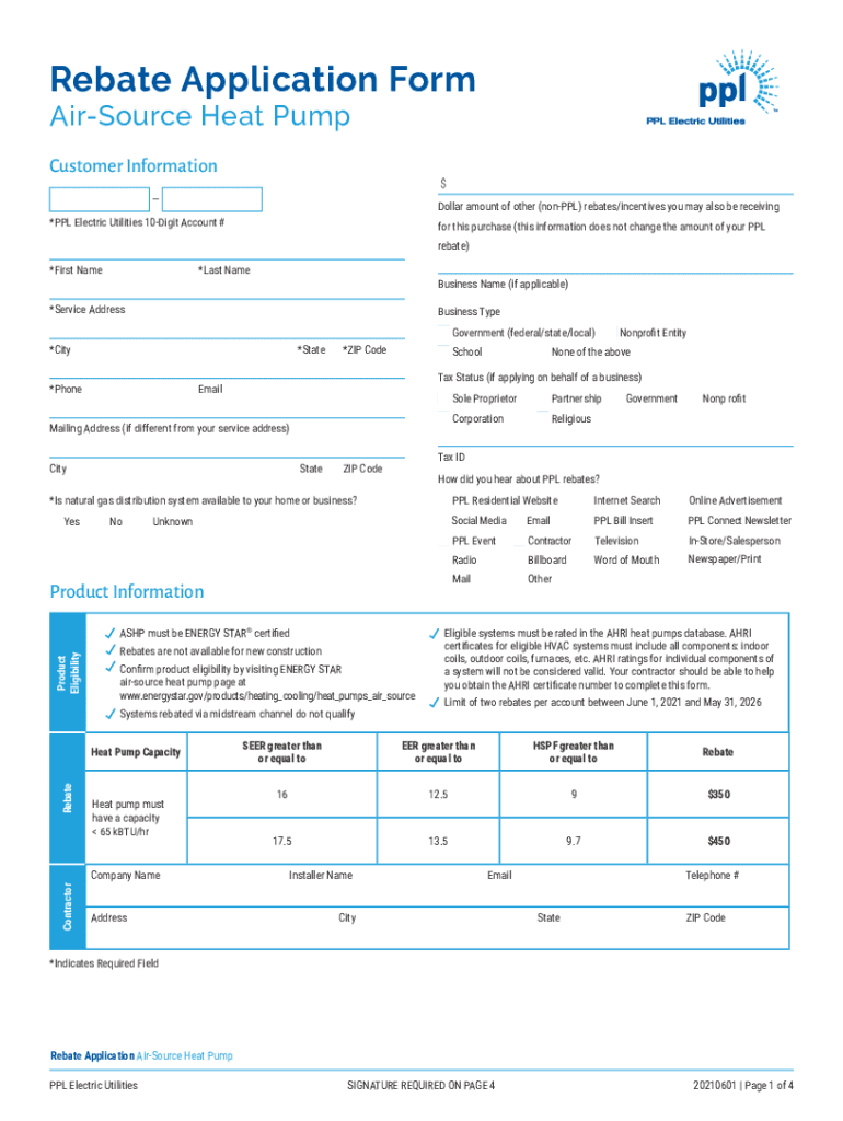 Rebate Application Form AppSource Heat Pump Customer Information$Dollar amount of other (nonPPL) rebates/incentives you may also be receiving×PPL Electric Utilities 10Digit Account #for this purchase