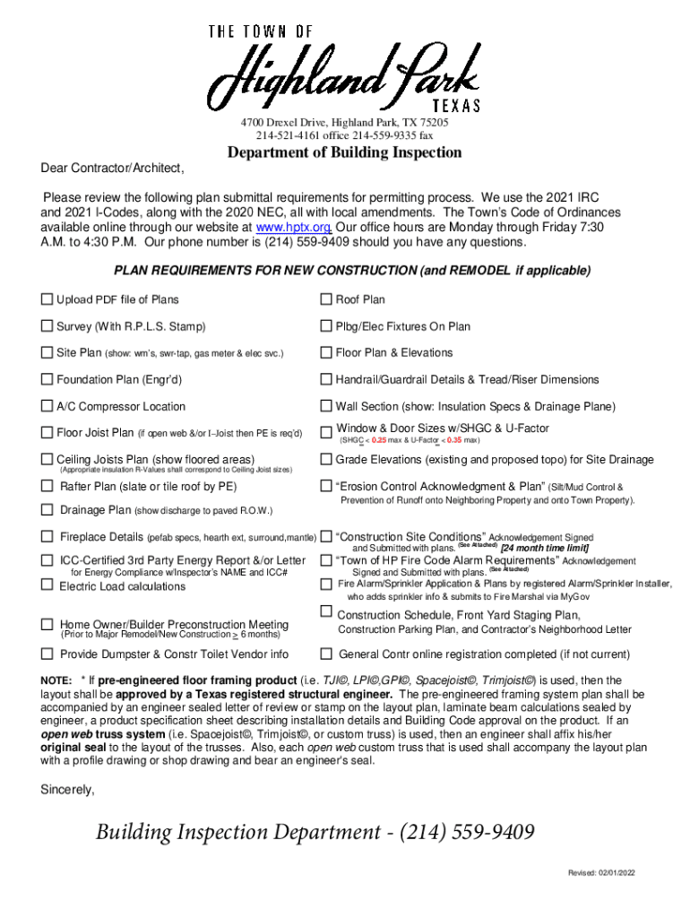 4700 Drexel Drive, Highland Park, TX 75205 2145214161 office 2145599335 department of Building Inspection Dear Contractor/Architect, Please review the following plan submittal requirements for permitting