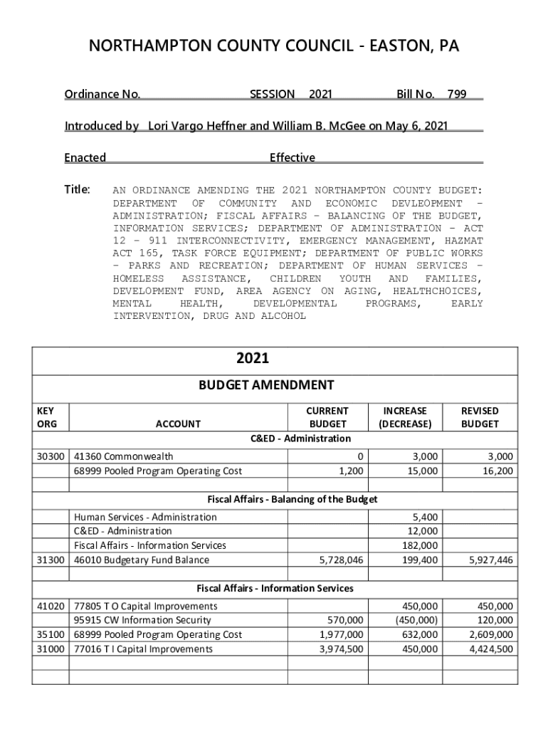 NORTHAMPTON COUNTY COUNCIL EASTON, PA Ordinance No.SESSION2021Bill No.799Introduced by Lori Cargo Hefner and William B. McGee on May 6, 2021, Enacted Title:Effective AN ORDINANCE AMENDING THE 2021