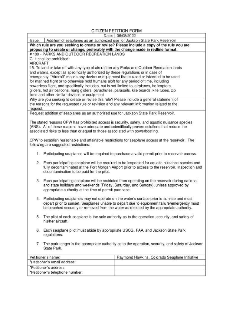 CITIZEN PETITION FORM Date: 06/08/2022 Issue: Addition of seaplanes as an authorized use for Jackson State Park Reservoir Which rule are you seeking to create or revise? Please include a copy of the