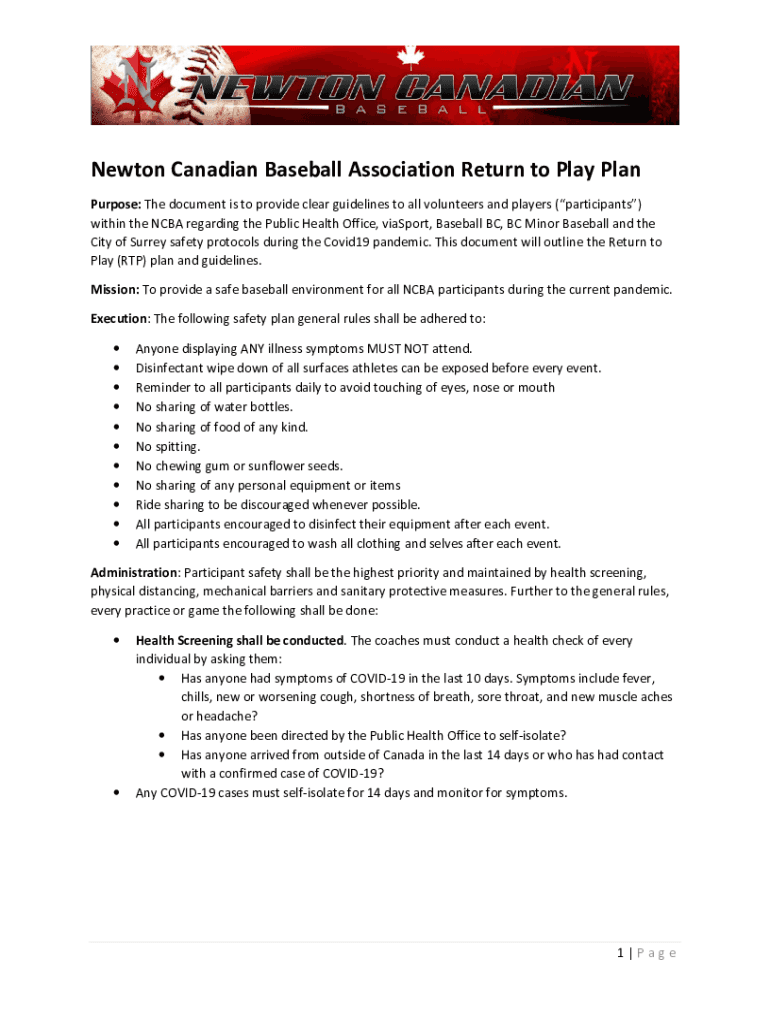 Newton Canadian Baseball Association Return to Play Plan Purpose: The document is to provide clear guidelines to all volunteers and players (participants) within the NCAA regarding the Public Health