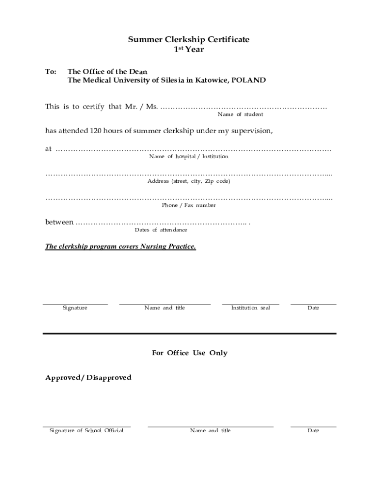 Summer Clerkship Certificate 1st Year To:The Office of the Dean The Medical University of Silesia in Katowice, POLANDThis is to certify that Mr. / Ms. Name of student has attended 120 hours of summer