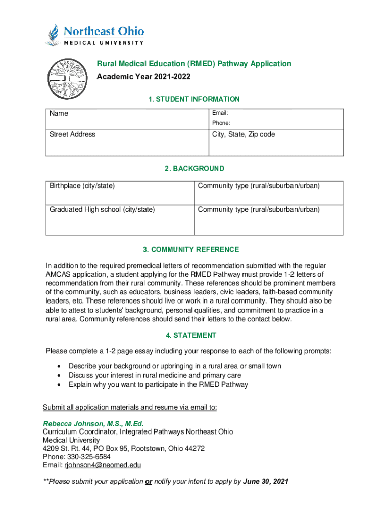 Get the free Rural Medical Education (RMED) Pathway Application
