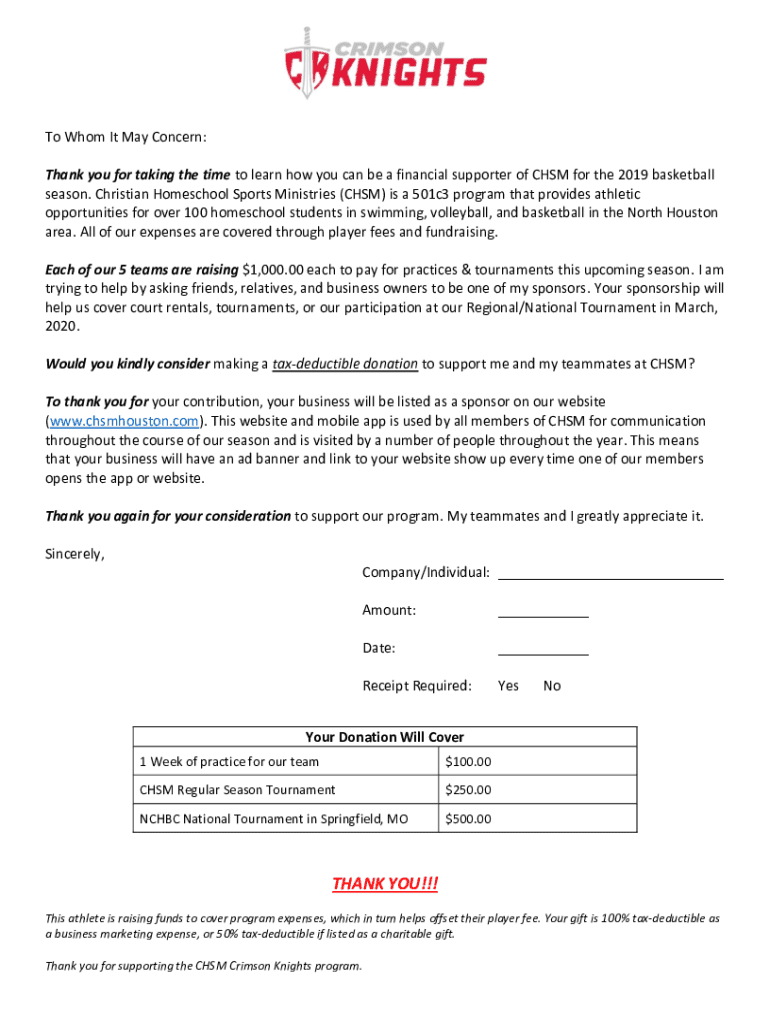 To Whom It May Concern: Thank you for taking the time to learn how you can be a financial supporter of CHASM for the 2019 basketball season. Christian Homeschool Sports Ministries (CHASM) is a 501c3