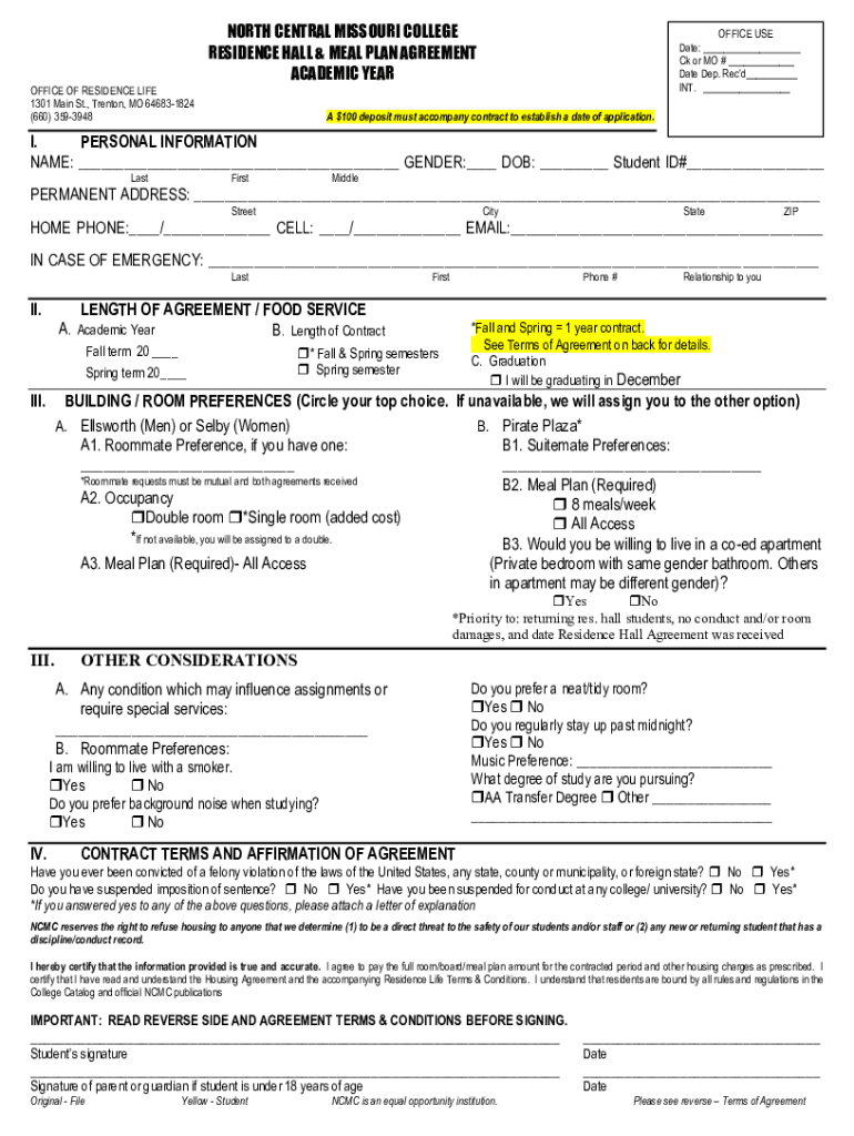 Get the free north central missouri college residence hall & meal plan agreement ...