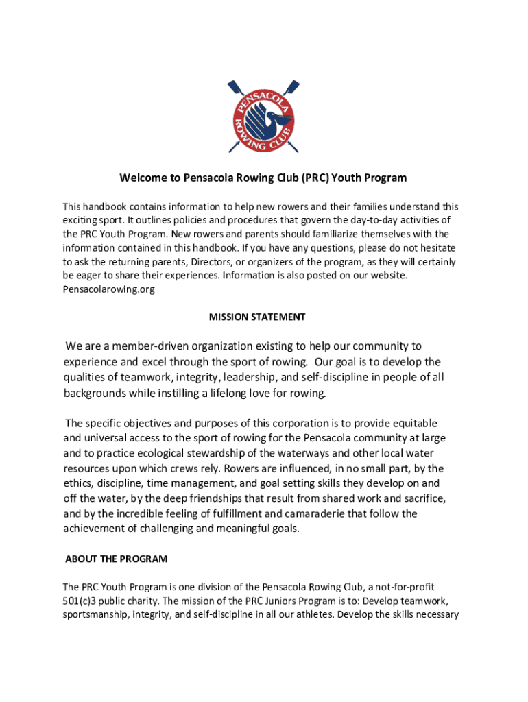 Welcome to Pensacola Rowing Club (PRC) Youth Program This handbook contains information to help new rowers and their families understand this exciting sport. It outlines policies and procedures that