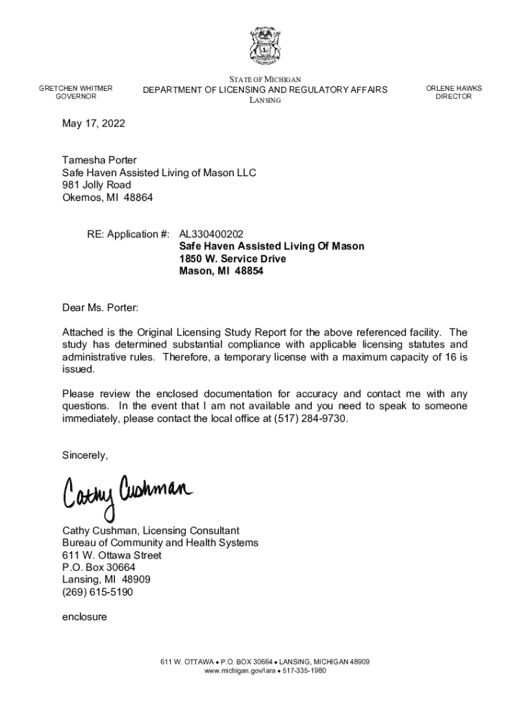 GRETCHEN WHITMER GOVERNORATE OF MICHIGAN DEPARTMENT OF LICENSING AND REGULATORY AFFAIRS LANSINGORLENE HAWKS DIRECTOR May 17, 2022, Tames ha Porter Safe Haven Assisted Living of Mason LLC 981 Jolly