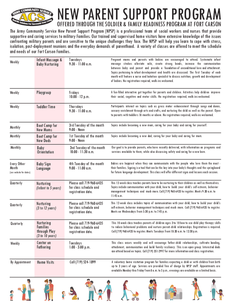 NEW PARENT SUPPORT PROGRAM OFFERED THROUGH THE SOLDIER & FAMILY READINESS PROGRAM AT FORT Carson Army Community Service New Parent Support Program (PSP) is a professional team of social workers and