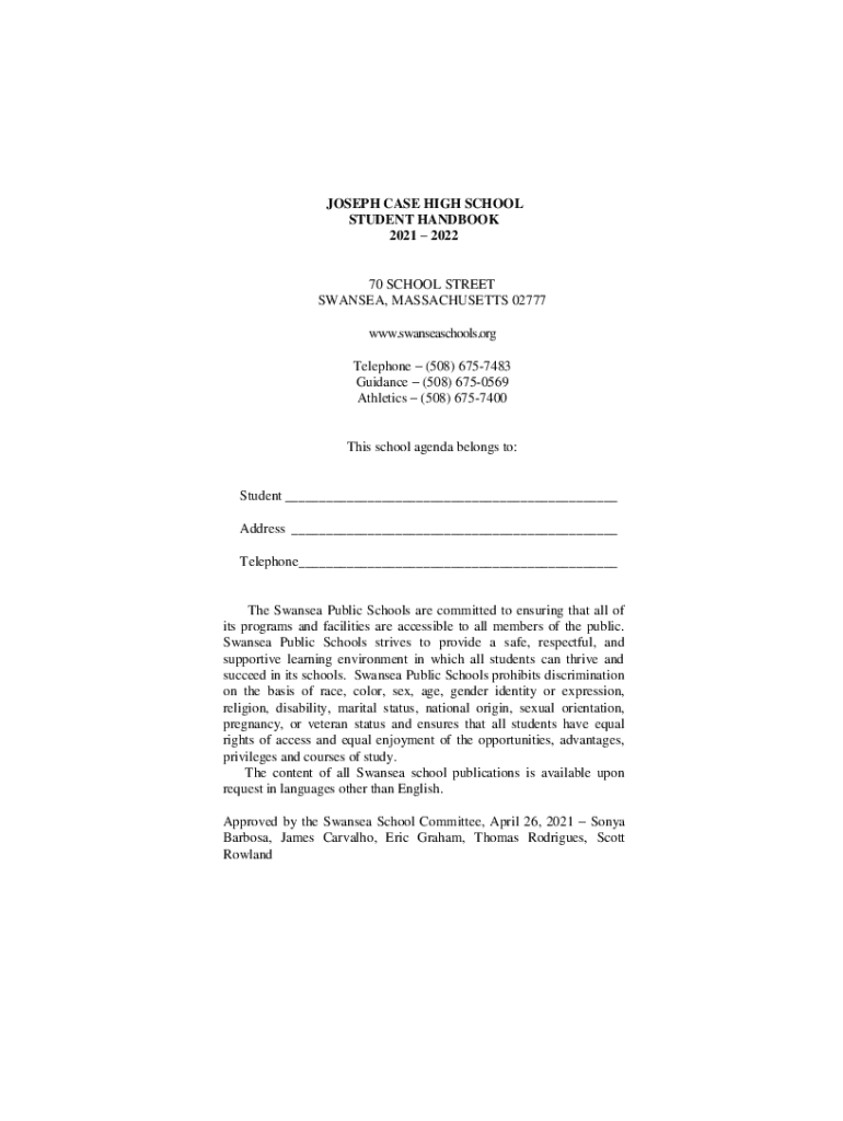 JOSEPH CASE HIGH SCHOOL STUDENT HANDBOOK 2021 202270 SCHOOL STREET SWANSEA, MASSACHUSETTS 02777 www.swanseaschools.org Telephone (508) 6757483 Guidance (508) 6750569 Athletics (508) 6757400This school