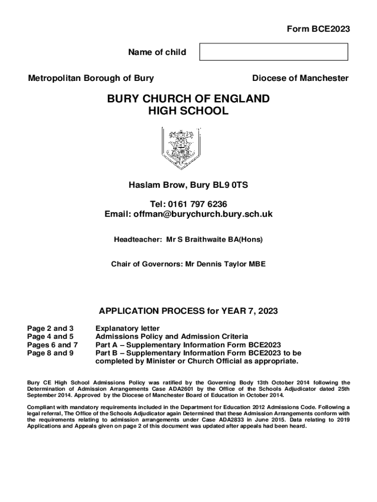 Form BCE2023 Name of child Metropolitan Borough of BuryDiocese of ManchesterBURY CHURCH OF ENGLAND HIGH SCHOOLHaslam Brow, Bury BL9 0TS Tel: 0161 797 6236 Email: offman@burychurch.bury.sch.uk Headteacher: