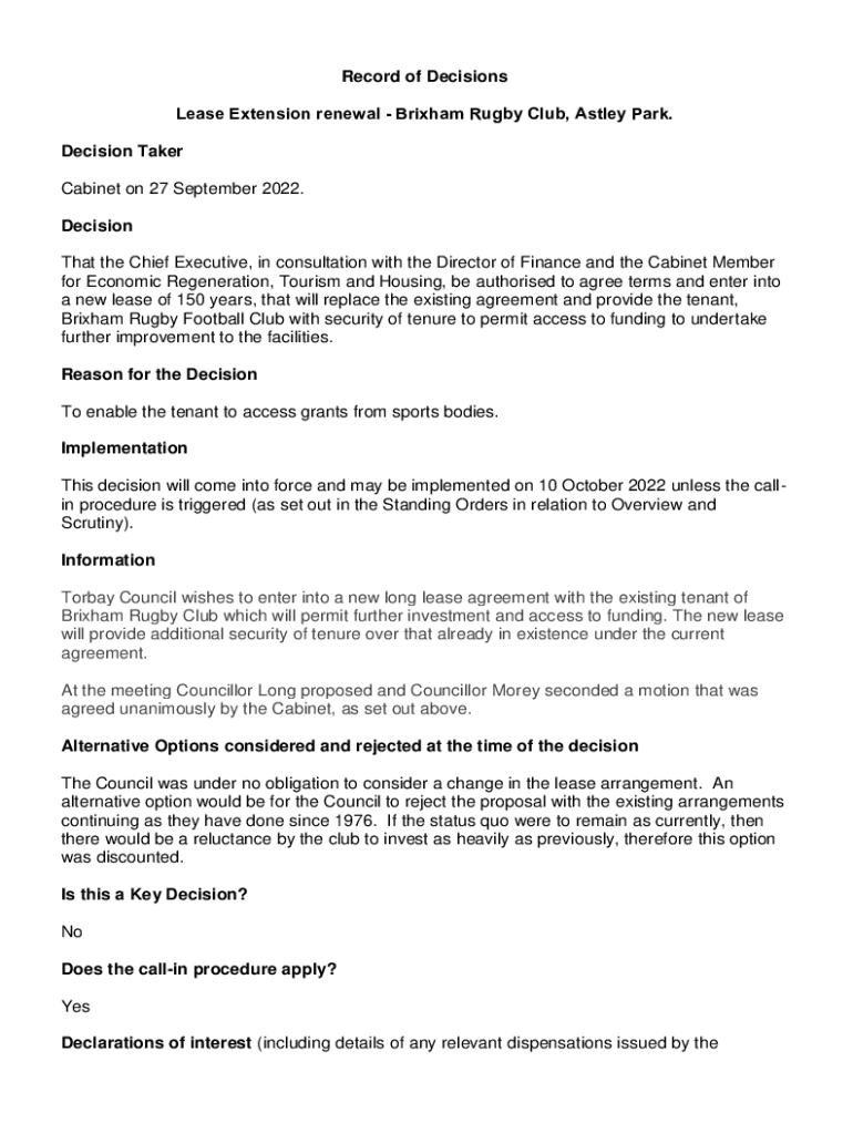 Get the free Brixham Rugby Club, Astley Park. Decision Taker Cabinet ...