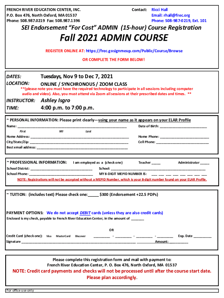 FRENCH RIVER EDUCATION CENTER, INC. P.O. Box 476, North Oxford, MA 01537 Phone: 508.987.0219 Fax: 508.987.1396Contact: Rich Hall Email: rhall@frec.org Phone: 5089870219, Ext. 101SEI Endorsement For