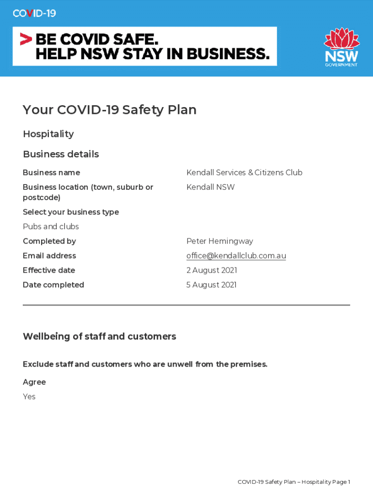 Your COVID-19 Safety Plan Hospitality Business details Business name Kendall Services & Citizens Clumsiness location (town, suburb or postcode)Kendall Select your business type Pubs and clubs Completed