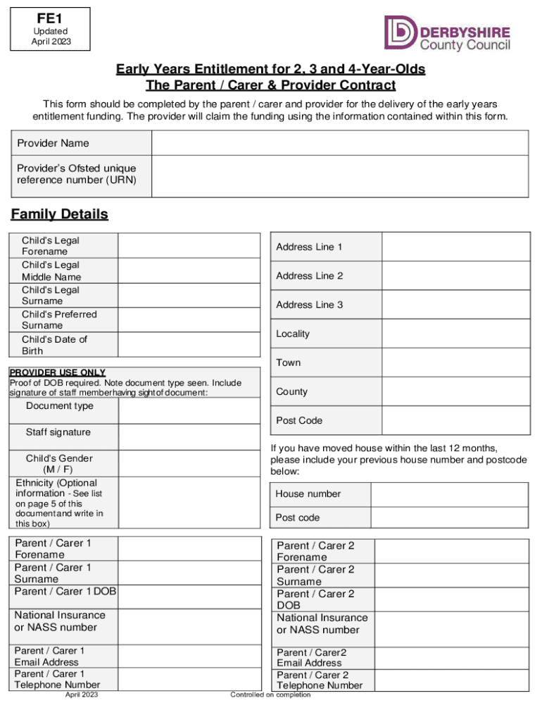 FE1 Updated April 2023Early Years Entitlement for 2, 3 and 4YearOlds The Parent / Carer & Provider Contract This form should be completed by the parent / carer and provider for the delivery of the