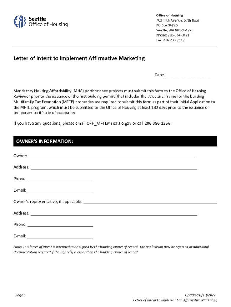 Office of Housing 700 Fifth Avenue, 57th floor PO Box 94725 Seattle, WA 981244725 Phone: 2066840721 Fax: 2062337117Letter of Intent to Implement Affirmative Marketing Date: ___ Mandatory Housing Affordability