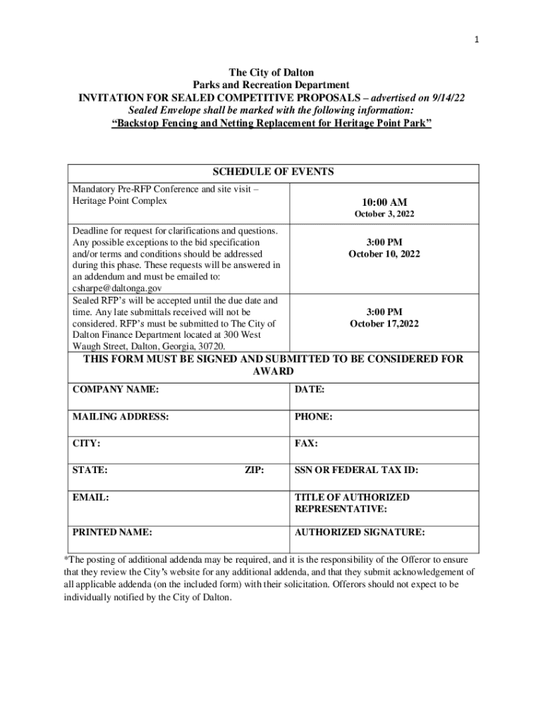1The City of Dalton Parks and Recreation Department INVITATION FOR SEALED COMPETITIVE PROPOSALS advertised on 9/14/22 Sealed Envelope shall be marked with the following information: Backstop Fencing