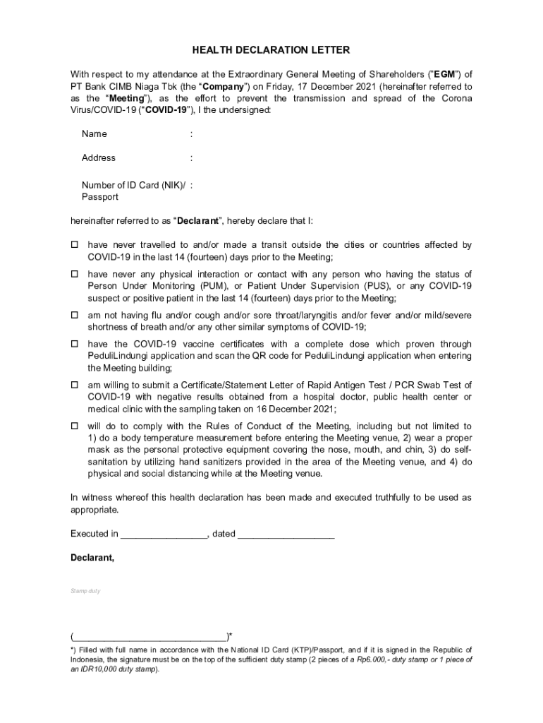 HEALTH DECLARATION LETTER With respect to my attendance at the Extraordinary General Meeting of Shareholders (EGG) of PT Bank CLIMB IAGA TBK (the Company) on Friday, 17 December 2021 (hereinafter