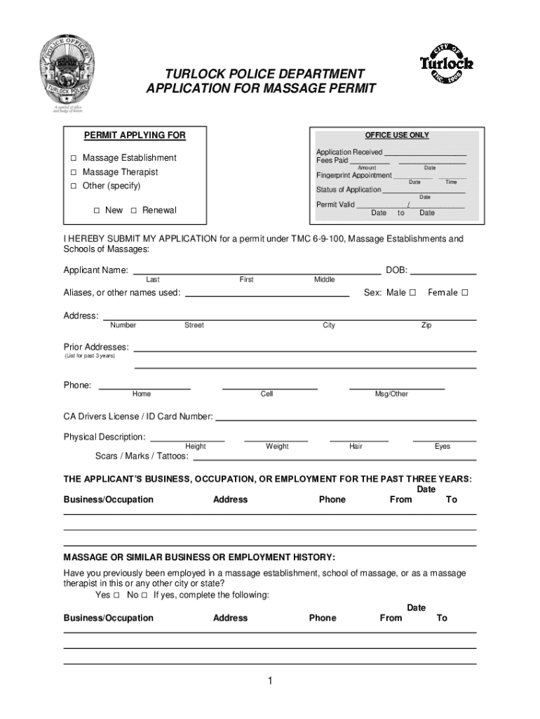 TURLOCK POLICE DEPARTMENT APPLICATION FOR MASSAGE PERMITPERMIT APPLYING OFFICE USE ONLY Massage EstablishmentApplication Received ___ Fees Paid ___ ___ Massage TherapistFingerprint Appointment ___