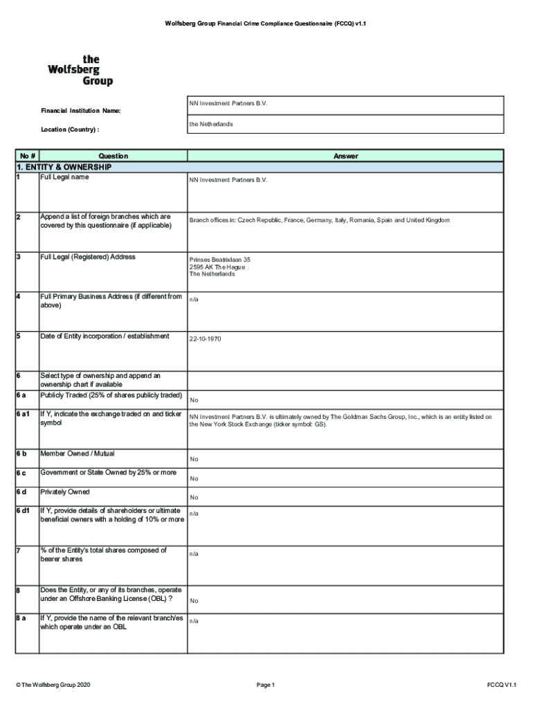 Wolves berg Group Financial Crime Compliance Questionnaire (FCC) v1.1NN Investment Partners B.V. Financial Institution Name: Location (Country) :No #the NetherlandsQuestionAnswer1. ENTITY & OWNERSHIP