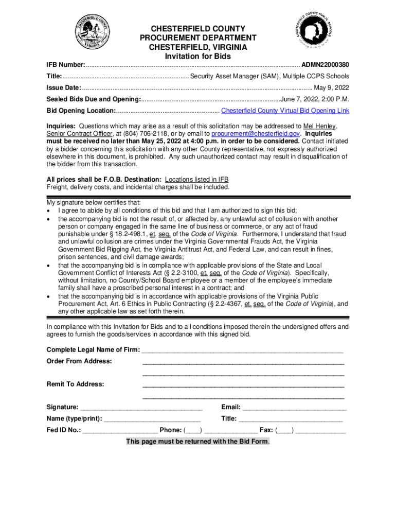 CHESTERFIELD COUNTY PROCUREMENT DEPARTMENT CHESTERFIELD, VIRGINIA Invitation for Bids IF Number: ........................................................................................................................