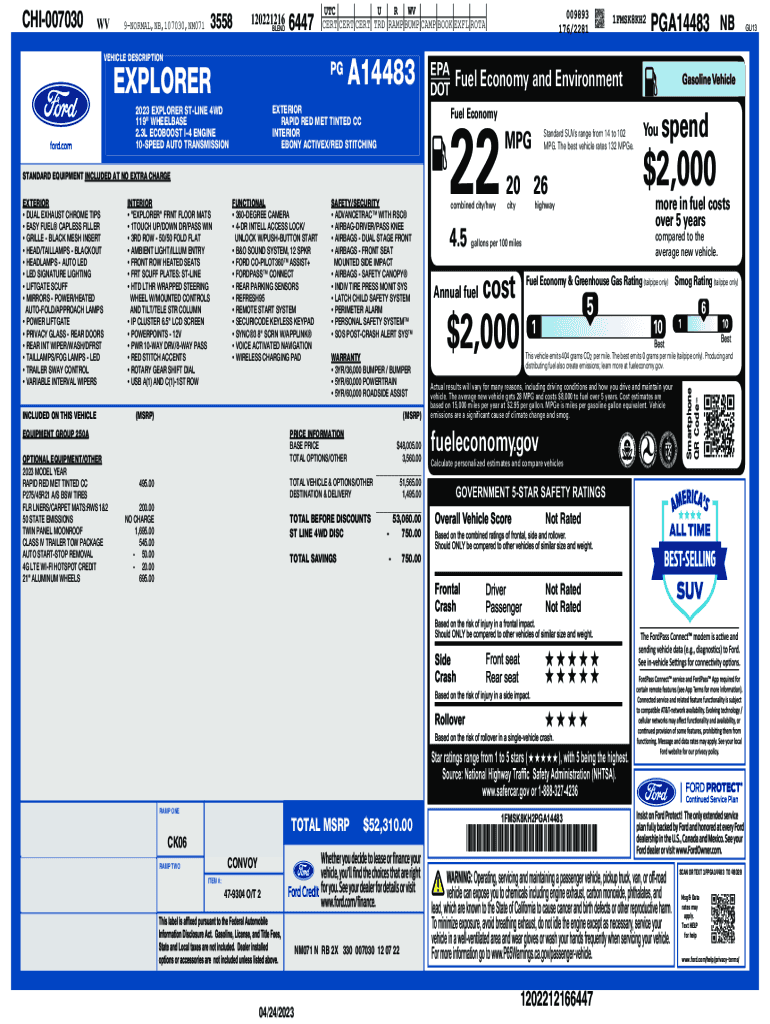 WV9NORMAL,NB,107030,NM07135586447VEHICLE DESCRIPTION UTC U R WV CERT CERT CERT TRY RAMP BUMP CAMP BOOK EFL ROTAPGEXPLORERA14483EXTERIOR RAPID RED MET TINTED CC INTERIOR EBONY ActiveX/RED STITCHING2023