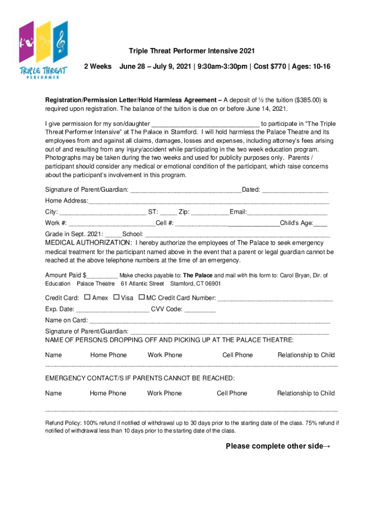 Triple Threat Performer Intensive 2021 2 Weeks June 28 July 9, 2021 | 9:30am3:30pm | Cost $770 | Ages: 1016Registration/Permission Letter/Hold Harmless Agreement A deposit of the tuition ($385.00)