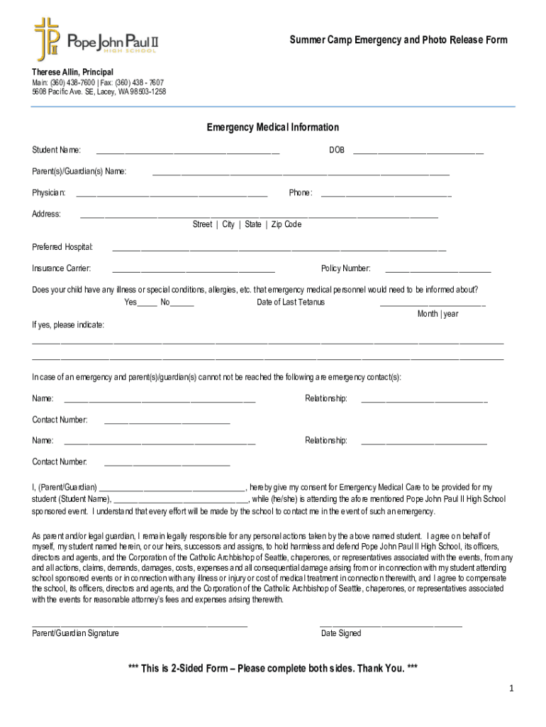 Summer Camp Emergency and Photo Release Form Therese Allen, Principal Main: (360) 4387600 | Fax: (360) 438 7607 5608 Pacific Ave. SE, Lacey, WA 985031258Emergency Medical Information Student Name:___Parent(s)/Guardian(s)