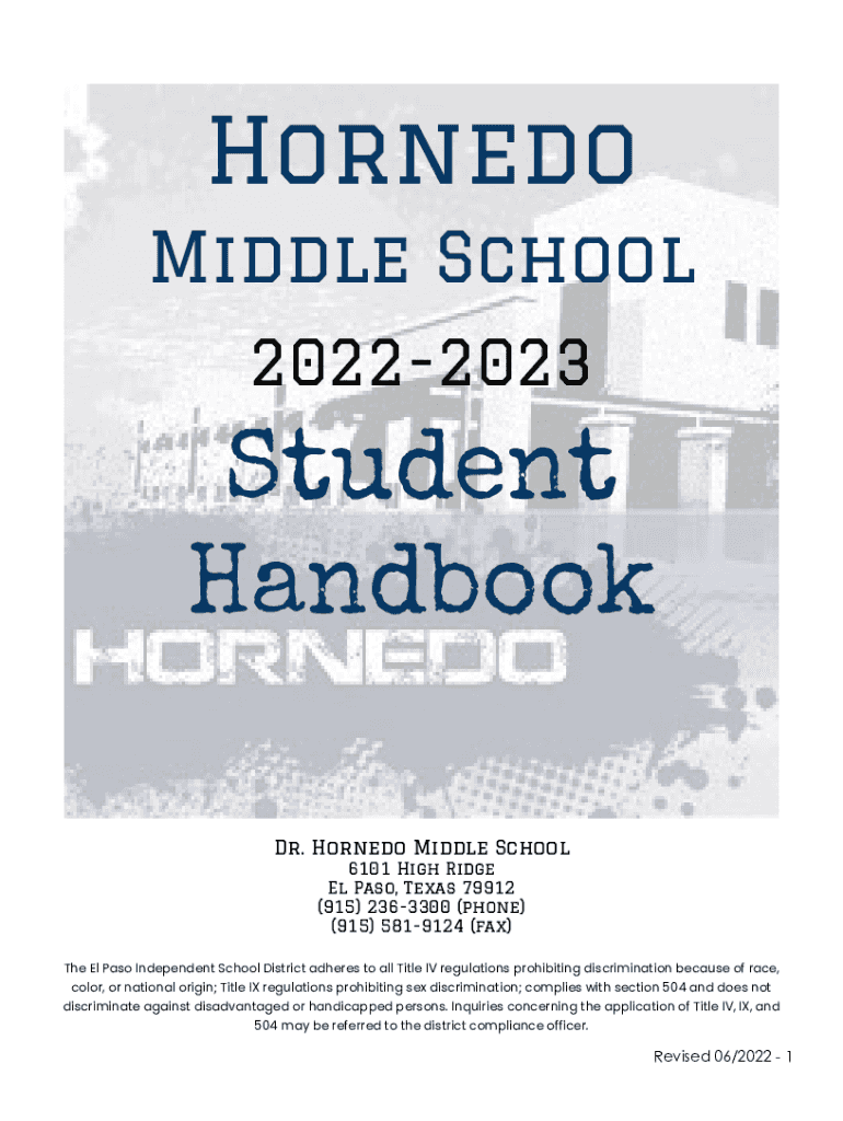Horned Middle School 20222023Student Handbook Dr. Horned Middle School 6101 High Ridge El Paso, Texas 79912 (915) 2363300 (phone) (915) 5819124 (fax)The El Paso Independent School District adheres