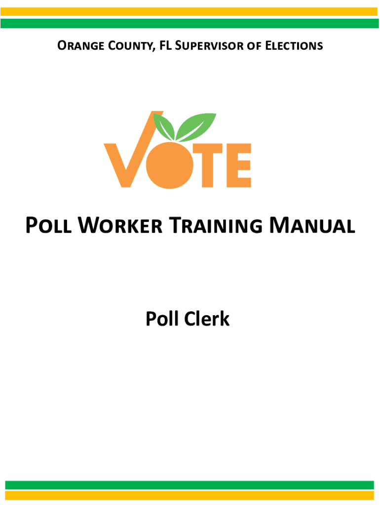 Orange County, FL Supervisor of ElectionsPoll Worker Training Manually ClerkPoll Worker Training Manual:Contents Page General Information3I. The Election Team46II. The Polling Place69III. Interacting