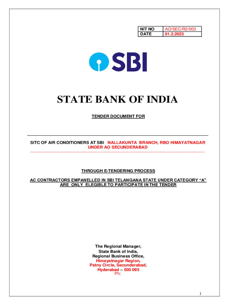NIT NO DAT EAO/SEC/R2/003 01.2.2023STATE BANK OF INDIA TENDER DOCUMENT FORMIC OF AIR CONDITIONERS AT SBI NALLAKUNTA BRANCH, HBO VIJAYANAGAR UNDER AO SECUNDERABAD THROUGH TENDERING PROCESS AC CONTRACTORS