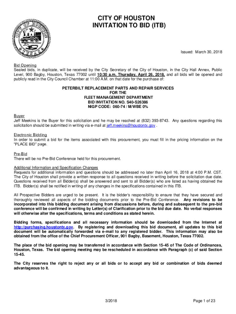CITY OF HOUSTON INVITATION TO BID (ITB)Issued: March 30, 2018, Bid Opening Sealed bids, in duplicate, will be received by the City Secretary of the City of Houston, in the City Hall Annex, Public