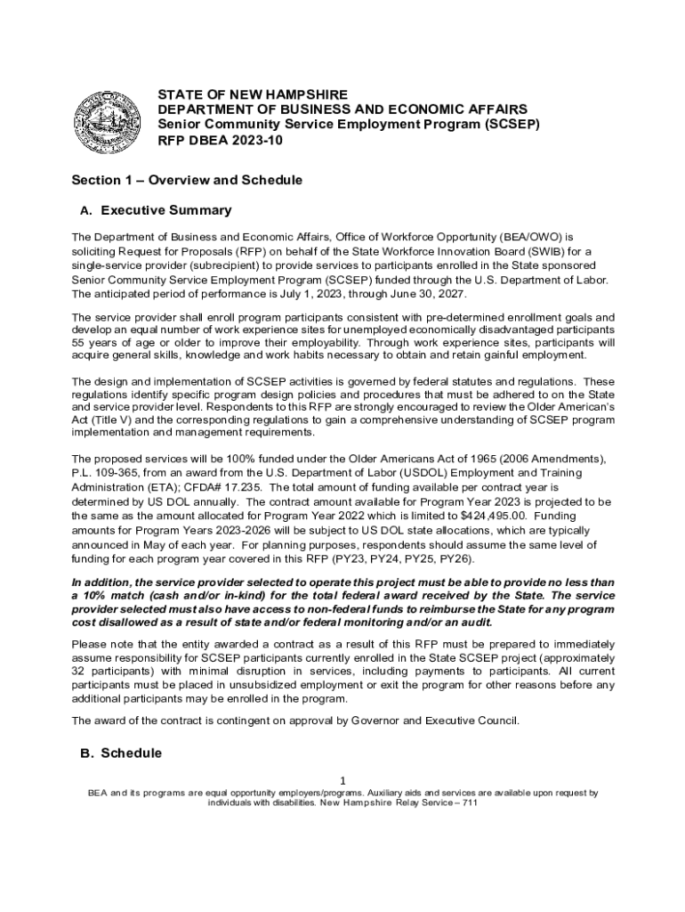 STATE OF NEW HAMPSHIRE DEPARTMENT OF BUSINESS AND ECONOMIC AFFAIRS Senior Community Service Employment Program (SCEP) RFP DBA 202310 Section 1 Overview and Schedule A. Executive Summary The Department