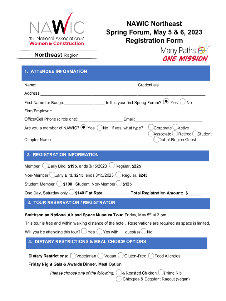 NARIC Northeast Spring Forum, May 5 & 6, 2023 Registration Form1. ATTENDEE INFORMATION Name: ___ Credentials:___ Address:___ First Name for Badge:___ Is this your first Spring Forum? YesNoFirm/Employer: