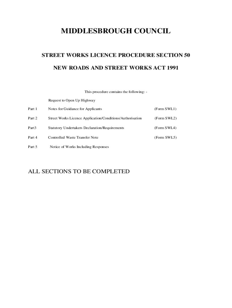 MIDDLESBROUGH COUNCIL STREET WORKS License PROCEDURE SECTION 50 NEW ROADS AND STREET WORKS ACT 1991This procedure contains the following: Request to Open Up Highway Part 1Notes for Guidance for Applicants(Form