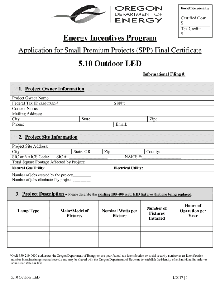 For office use onlyEnergy Incentives ProgramCertified Cost: $ Tax Credit: application for Small Premium Projects (SPP) Final Certificate5.10 Outdoor LED Informational Filing #:1. Project Owner Information